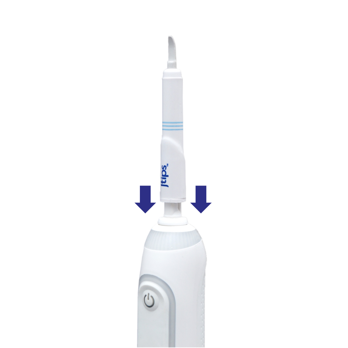 Fit Jtips onto a compatible electric toothbrush and press START.